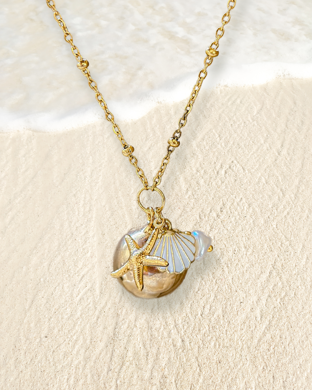 Symbolisme : Le pendentif étoile de mer représente la guidance et la protection, tandis que la perle de nacre symbolise la pureté et la beauté. Le coquillage ajoute une touche naturelle, reliée à la mer et à l'instinct maternel.
